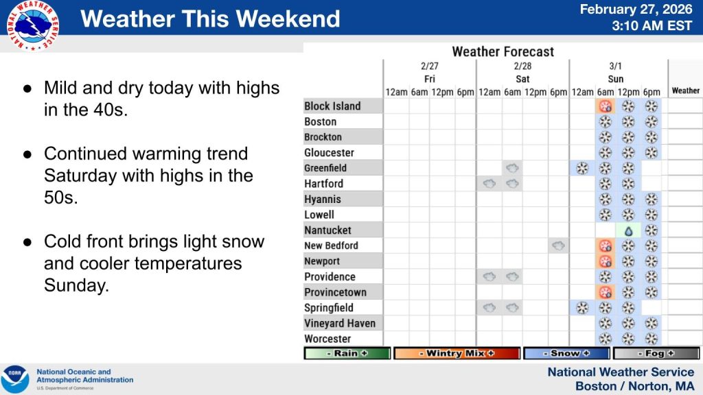 Today, Feb. 27: Mostly sunny, pleasant; 38 F to 44 F.