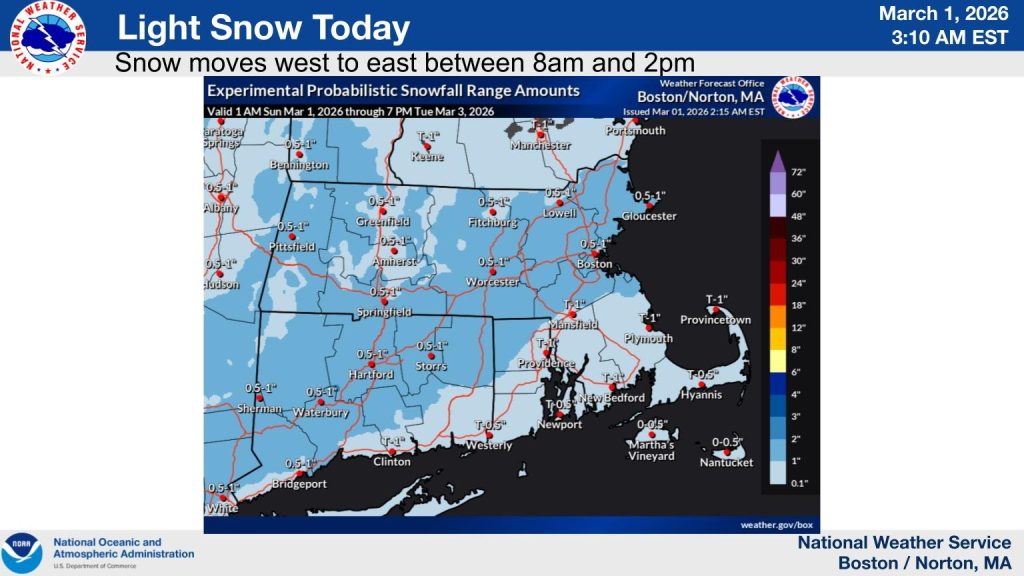 Today, Mar. 1: A period of snow through midday, accumulation a coating to 2”; 30s.