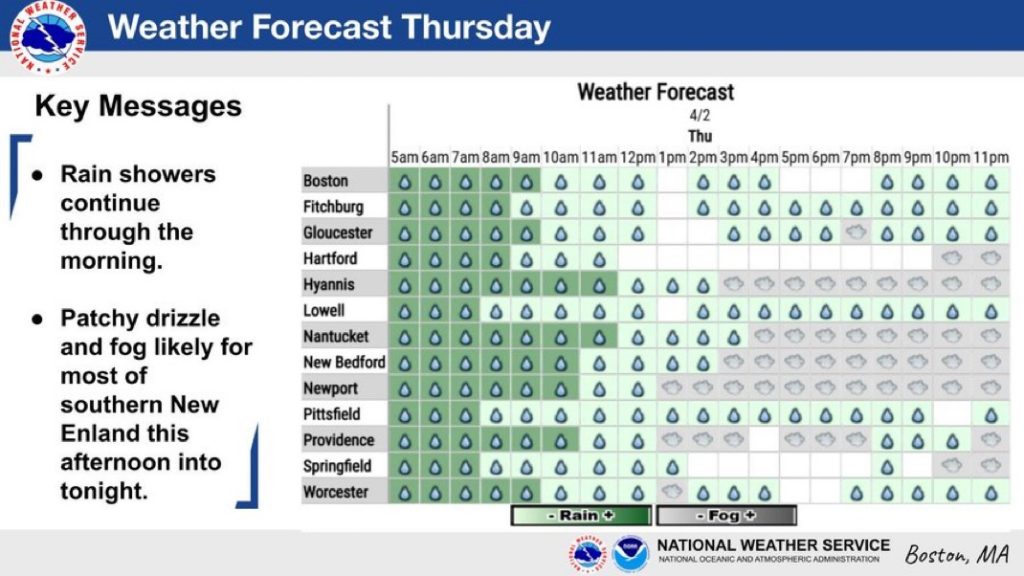 Today, Apr. 2: Light rain and drizzle ending, remaining cloudy and chilly; 40 F to 45 F.